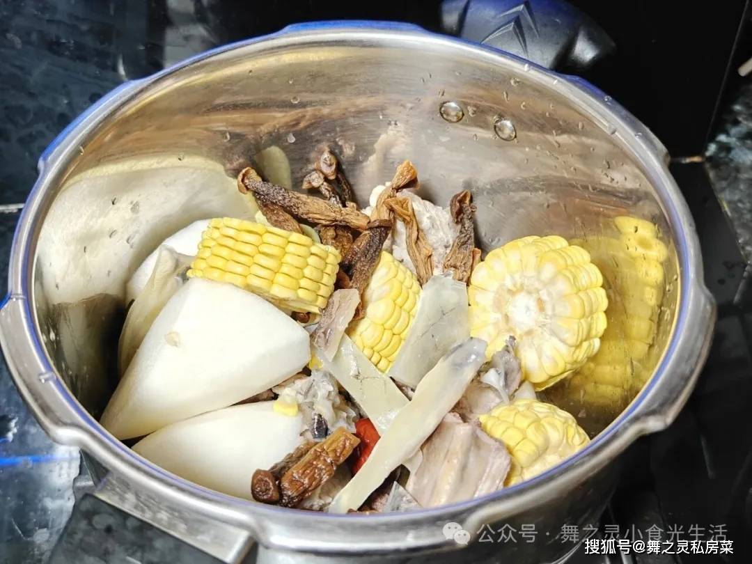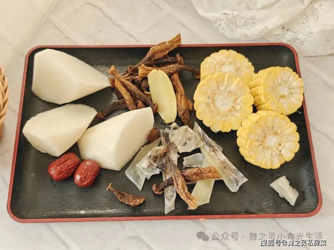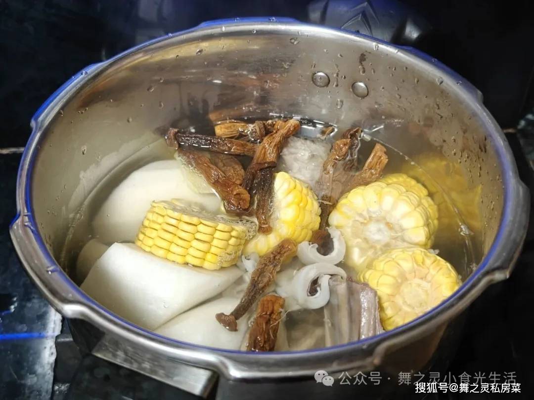配料:玉米一根、白萝卜适量、鹿茸菇(羊肚菌之类也是非常好的)、墨鱼干适量,另外就是姜片2片,还有红枣3个左右即可