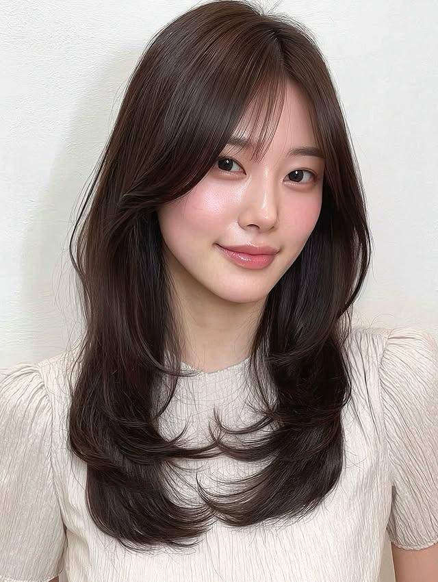 法式刘海中长卷堪称“脸型救星”,轻薄蓬松的法式刘海遮掩中庭过长的烦恼,S型大卷与层次内扣的发尾,顺着肩颈线条自然垂落,