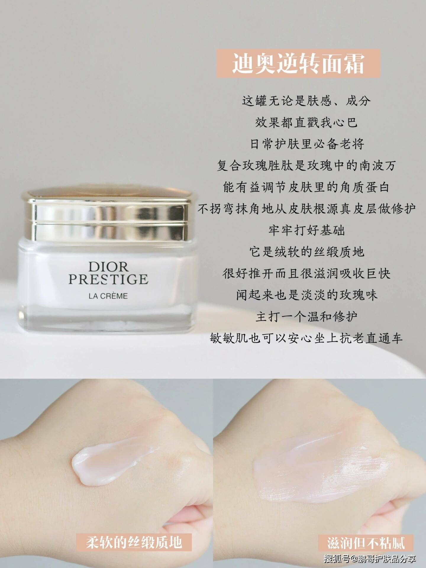 迪奥家这款属于保湿型面霜,里面是格兰维尔玫瑰+复合玫瑰胜肽,能够滋润和喂饱皮肤营养,让皮肤享受到如玫瑰般的细心呵护,它是轻盈的面霜质地,上脸后是很柔润的肤感。