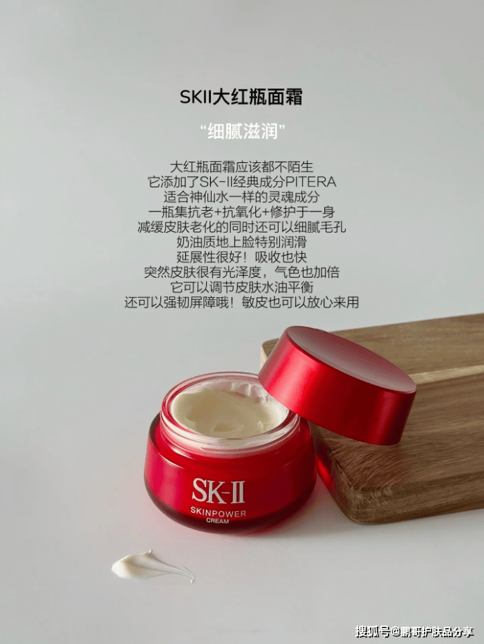 主要作用是细腻滋润,大红瓶面霜应该都不陌生,它添加了SK-II经典成分PITERA,用了神仙水一样的灵魂成分,一瓶集抗老+抗氧化+修护于一身,减缓皮肤老化的同时,还可以细腻毛孔。