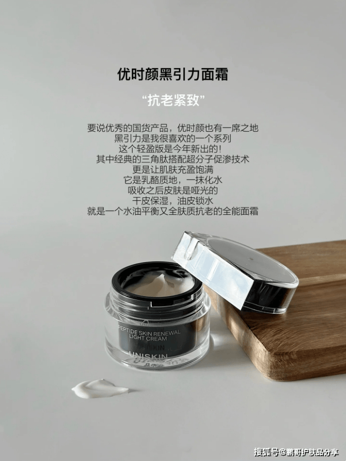 主要作用是饱满紧致、淡纹提拉,油皮、混油皮姐妹总是让我推荐面霜,那这支轻盈版我觉得蛮值得爱出油的轻熟龄姐妹尝试,主打的核心成分是三角肽,同样是针对抗老,相比它家黑引力精华,无需建立耐受,总体更温和,适用人群也更广。