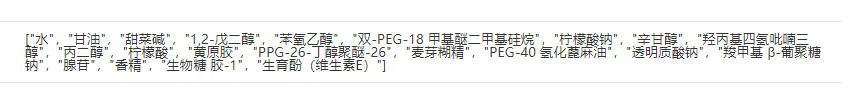 成分中的PPG-26-丁醇聚醚-26添加量虽然不大,但和PEG-氢化蓖麻油复配,除了发挥乳化剂、促溶剂的作用,还有促渗透的功效,有一点肌底液的作用。另外,PPG-26-丁醇聚醚-26能够给皮肤带来丝绒般的柔滑触感,常添加到一些高档化妆品中,营造高级的肤感。