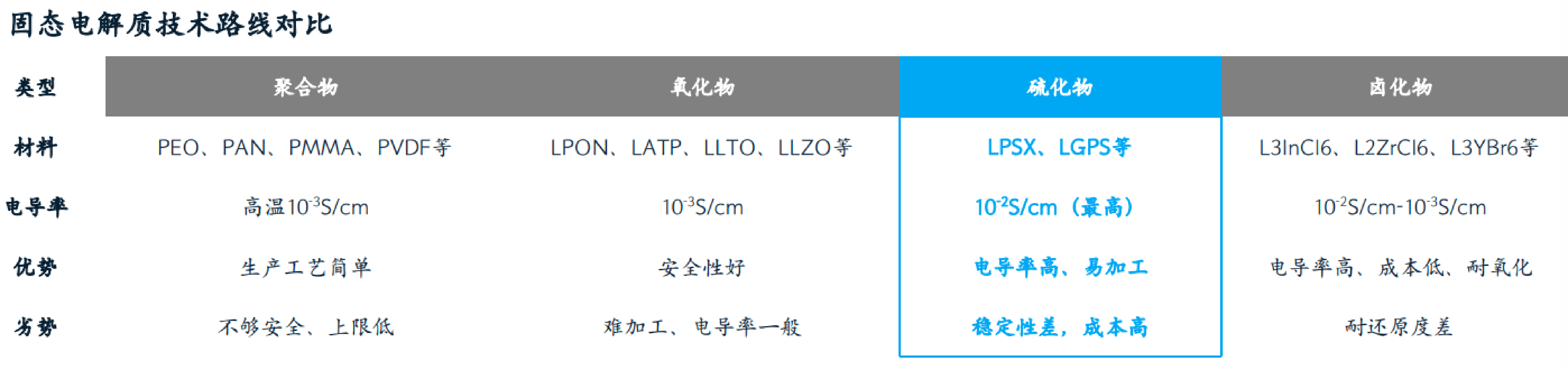 两种路线的主要区别在于:氧化物更容易实现量产,但离子电导率较低,导致电池能量密度有限;硫化物能量密度上限更高,而离子电导率是固态电池电解质的核心指标。