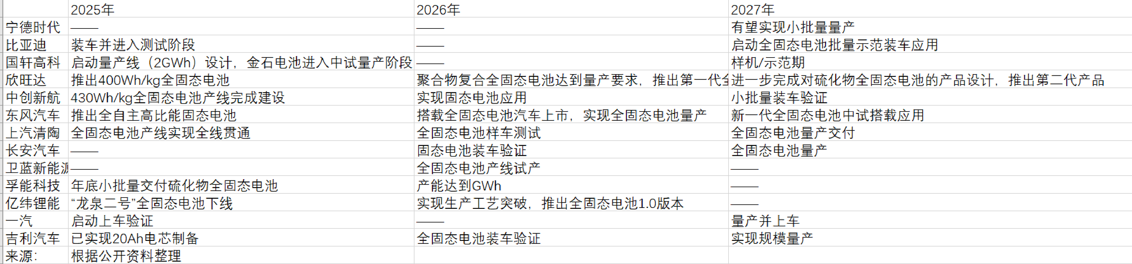 2025年2月,工信部等八部门联合印发《新型储能制造业高质量发展行动方案》,明确将固态电池列为重点攻关方向,并提出到2027年前打造3—5家龙头企业的目标。经济观察报梳理发现,多家头部企业均将2027年定位为固态电池量产元年。