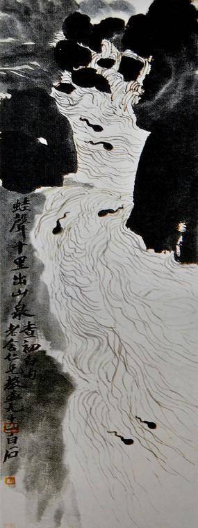 齐白石并未被这个难题难住。在经过一周的沉思后,他创作出了《蛙声十里出山泉》。这幅作品的画风依旧朴实无华,墨色主调,整个画面透露着古朴的气息。作品中的几笔简洁的水流、几只黑色小蝌蚪,恰到好处地体现了青蛙的存在,仿佛能听到那遥远的蛙声。这幅画并没有直接描绘青蛙,而是通过巧妙的留白和细节的表现,让人感受到青蛙的呼唤与自然的生机。