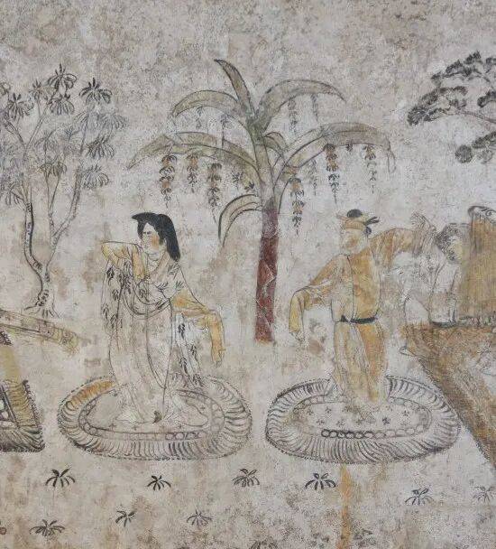 这幅《乐舞图》出土于唐代韩休墓墓室东壁。韩休,京兆长安人,开元二十一年(733)曾任宰相,开元二十八年(740)卒,时年68岁。韩休为官清廉正直,文采颇优。其子韩滉,也曾任唐德宗时的宰相,而且还是一位著名的画家,因绘画作品《五牛图》名闻天下。夫人柳氏,出身河东郡世家大族,天宝七年(748)卒,与韩休合葬于唐长安城东南的少陵原上,即今天西安市长安区大兆街道的郭新庄村。少陵原是唐代重要的墓葬区之一,这一带名人墓葬云集。韩休墓东南面是唐代宰相杜如晦家族墓,南面是唐玄宗贞顺皇后的敬陵,西面则是著名的韦氏家族墓、长孙无忌家族墓、郭子仪家族墓等。