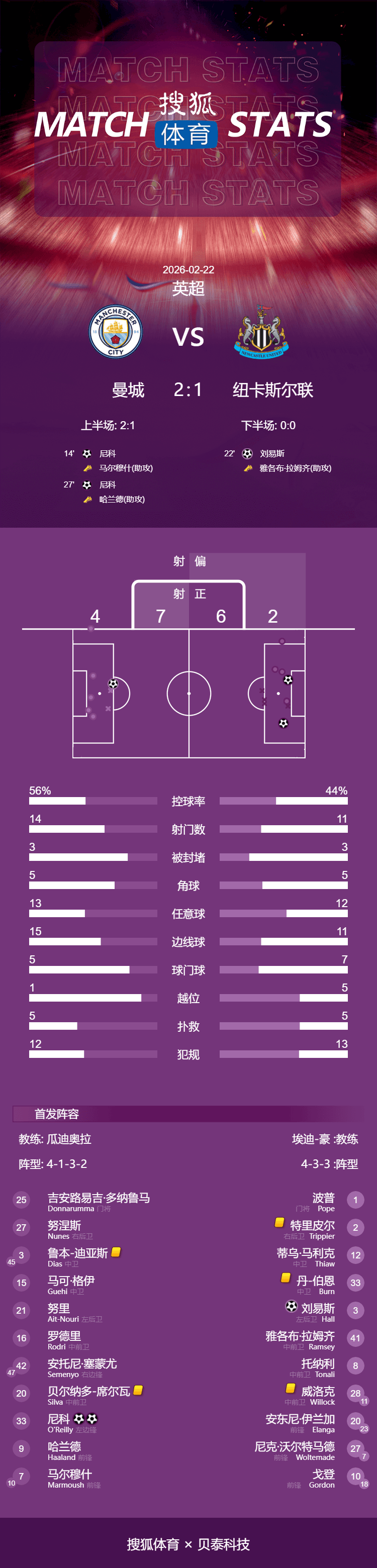 2026年2月22日凌晨4点,2025-2026赛季英超联赛第27轮迎来了一场焦点之战,曼城坐镇主场对阵纽卡。上半场,马尔穆什助攻,奥赖利率先破门。纽卡角球被顶出,刘易斯-霍尔射门击中努里后折射入网。哈兰德传中,奥赖利头球得分。随后,丹-伯恩头球建功,但是被判越位在先。下半场,两队均无建树。最终,曼城主场2-1战胜纽卡,迎来各项赛事的5连胜,并且在英超积分榜上将和领头羊阿森纳之间的积分差距缩小到2分。