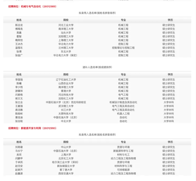 华北油田公布了2025年秋季高校毕业生招聘拟录用和递补人选公示,数百人的公示名单,除了石油系统的学校之外,其他学校基本都是985和211层次高校。除了再企宣和财务岗有一些本省重点高校之外,普通本科在进入国企方面只能靠运气和背景了。