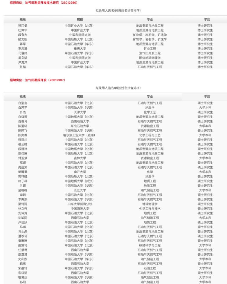 我们可以看到关于油气田勘探开发技术研究的岗位,基本上拟录取的同学都是中国矿业大学、中国石油大学、中国科学院大学的博士研究生,只有一名同学是重庆大学的矿业工程专业。