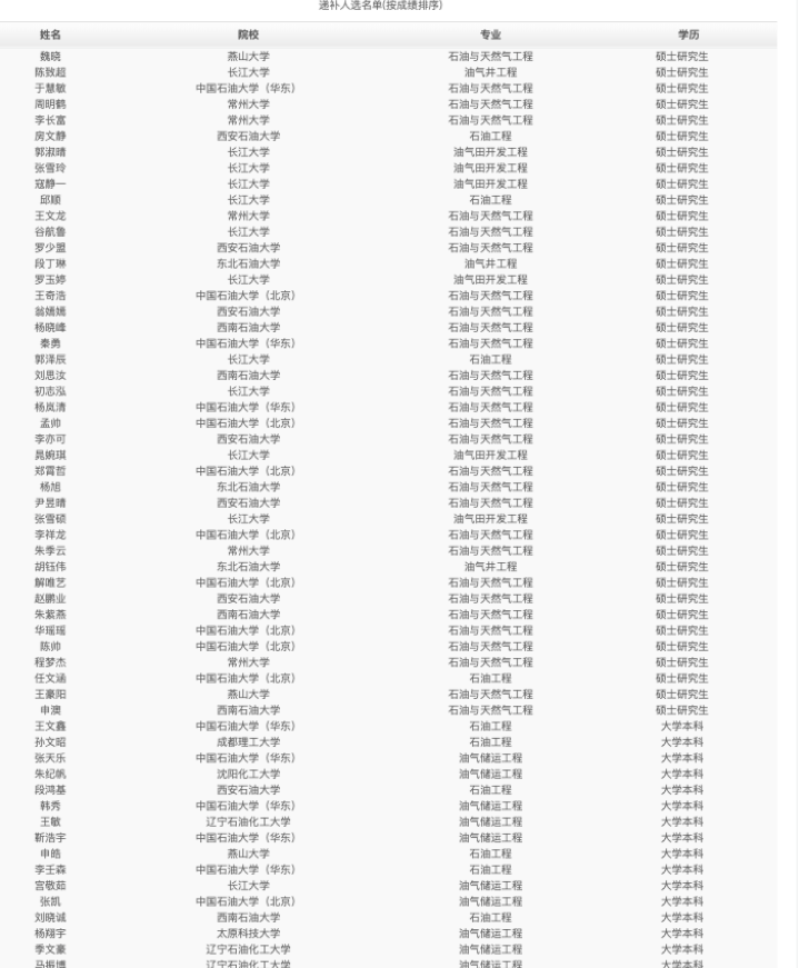 而油气田勘探开发更基本是石油系统高校的天下,要么是中国石油大学,要么是西南石油大学的学生,其他的高校除了长江大学、常州大学等之外,基本都是985的硕士研究生。其中比较引人注意的是有几名化学专业的学生,均为985高校学生。其实双非有些同学是是比较扎眼的。比如长江大学的那个同学,因为他不仅仅学校是双非,学历也只有大学本科,不知道是笔试成绩高,还是面试成绩强,显然很入招人的考官的法眼。