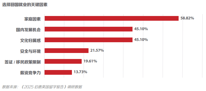 根据调研数据显示,58.82% 英国海归毕业生选择回国发展是考虑到家庭因素,这凸显了中国传统文化中家庭优先的价值观对海归决策的深刻影响,此外部分留学生本身依赖家庭经济投入,而毕业后的发展路径也常与家庭规划关联。