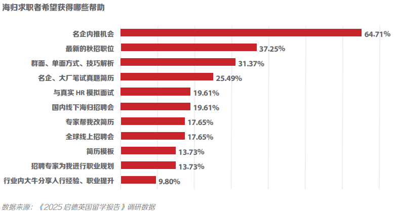 其次是最新秋招职位的资讯,占比 37.25%,秋招是国内企业集中招聘的关键窗口,而海归可能因时区、信息渠道差异,容易错过关键节点。这一需求凸显了海归对同步国内招聘节奏的迫切性。第三是群面、单面方式和技巧解析,占比 31.37%,国内外面试风格存在显著差异,部分海归担心自己会缺乏对国内面试逻辑的理解。这一数据反映出他们对适配国内求职场ఀ的技能补充需求。