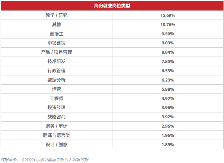 启德英国调研数据显示,英国海归学生目前从事的岗位中,教学 / 研究类岗位排名第一,占比 15.69%,英国的高等教育在文科、社科、理科等领域具有较强的实力和声誉,不少留学生选择的专业与教育、研究相关,如教育学、语言学、历史学、物理学等。