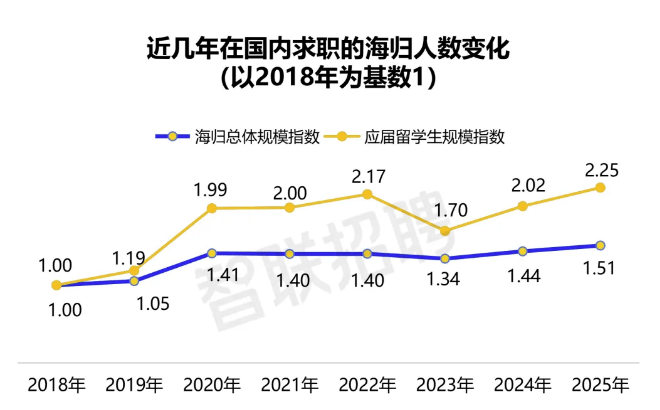 2026年 2月,智联招聘发布《2025中国海归就业调查报告》,2025年应届留学生回国规模同比增长12%,达到2018年的2.25倍,创下近八年来新高。同时,新质生产力崛起带动的产业需求,正在推动海归就业结构发生实质性变化。