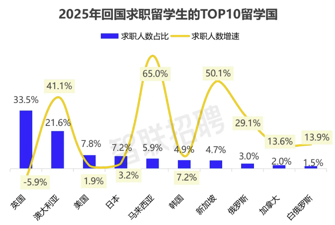 从2025年回国求职留学生的留学目的地来看,整体是呈现多元化趋势。其中英国、澳大利亚和美国仍为主流选择,占比分别为33.5%、21.6%和7.8%,值得关注的是,增长动能最强的集中于亚洲留学地——马来西亚和新加坡人数增速分别高达65%和50%,此外,澳大利亚(增速41.1%)、俄罗斯(增速29.1%)的留学生回国人数实现了快速增长。